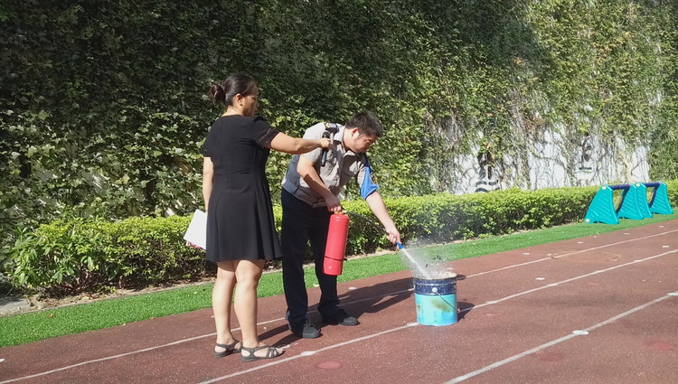 保衛(wèi)叔叔為我們演示如何正確使用消防滅火器。
