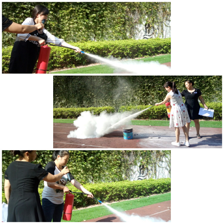 在距火焰兩米的地方,右手用力壓下壓把,左手拿著噴管左右搖擺,噴射干粉覆蓋燃燒區(qū),直至把火全部撲滅。