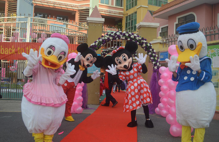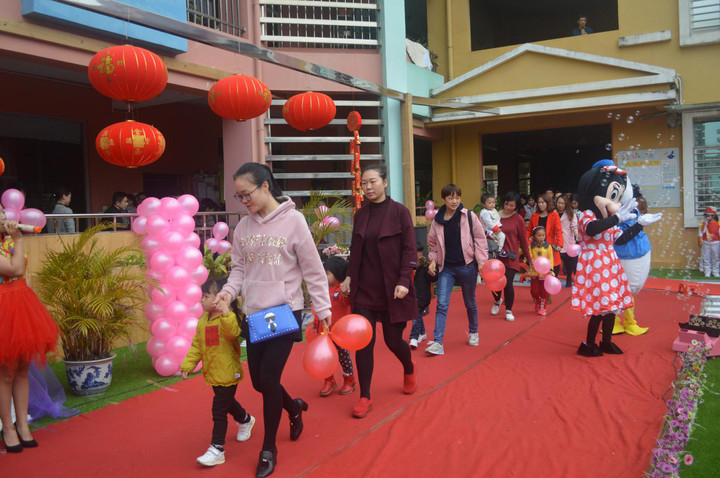 7:30開學典禮就正式開始啦!在老師們、卡通人物的迎接下,家長與寶寶們伴隨著歡快的音樂,快樂的歡呼起來;用互動的方式開啟了一系列的環節: