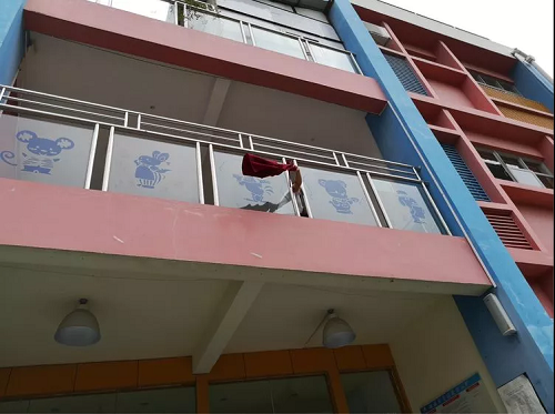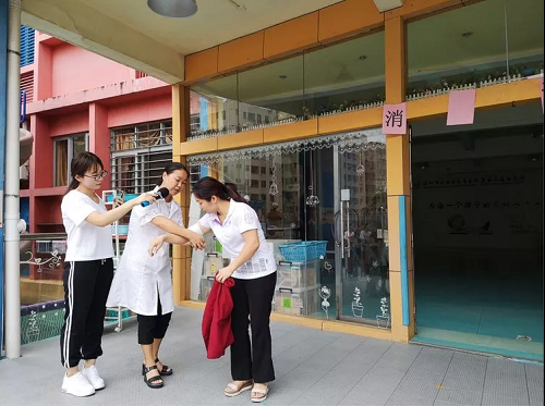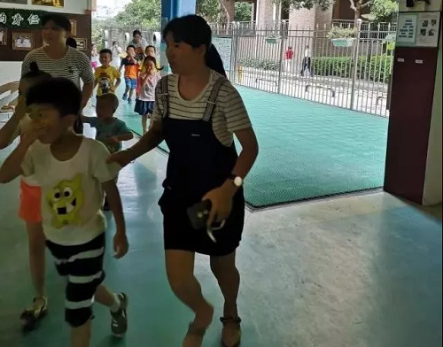 從教室撤離出來,老師在清點本班級幼兒人數是否全部撤離到安全地點。