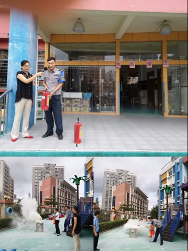 保安叔叔現場進行滅火器使用的講解示范,老師和孩子都參與其中,體驗正確使用滅火器。