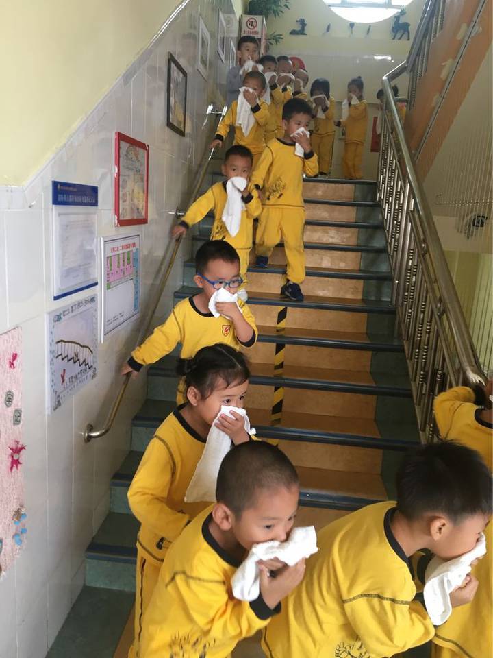 最后小朋友們有秩序的一個跟著一個從校車上撤離到安全地帶。