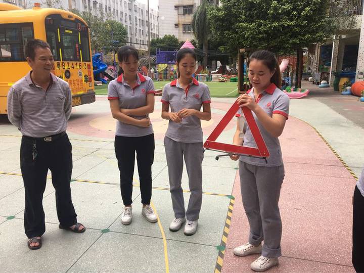 當校車著火時,校車司機立刻打開雙閃警示燈,緊急停車,迅速打開車門及停車示意臂,并在車后50米放警示牌,提示后面車輛繞行,防止二次傷害。與此同時,跟車老師迅速穩定小朋友們情緒,打開后安全門,組織小朋友迅速有序逃離。首先,老師們學習如何擺放警示牌,當車輛故障需要緊急停車時,記得一定要在車后50米處放置安全警示牌。