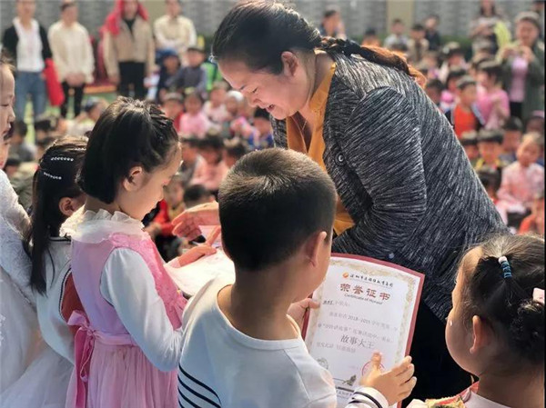 通過激烈的比賽,小朋友們都收獲了優秀證書,園長媽媽為小朋友們頒發“故事大王”獎狀。