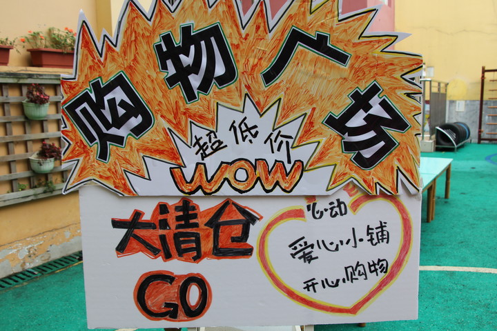 在義賣現場,大家都精心設計了漂亮的招牌、宣傳廣告,豐富多彩的廣告標語為今天的義賣增添了不色彩。看我們的小朋友們,坐在自己班的攤位前,家長們也在一旁協助著,想出各色各樣的口號來吸引其他小顧客們的注意。孩子們紛紛扮演起小“老板”的角色,熱情的向往來的小“顧客”推銷自己的商品。