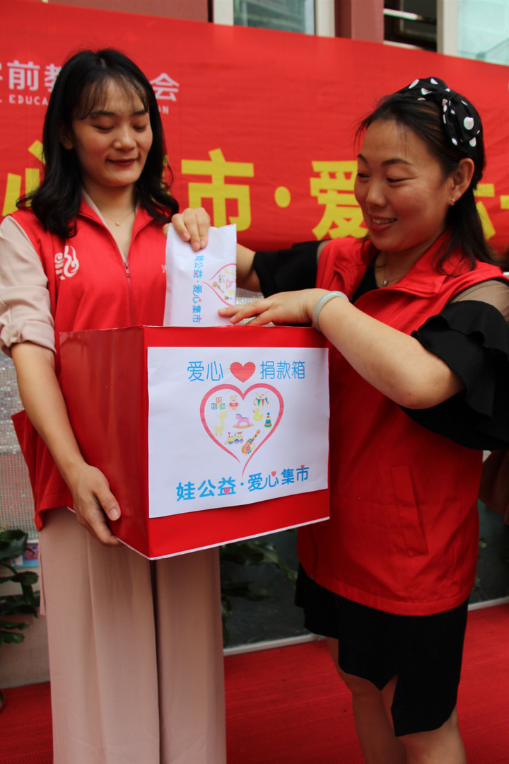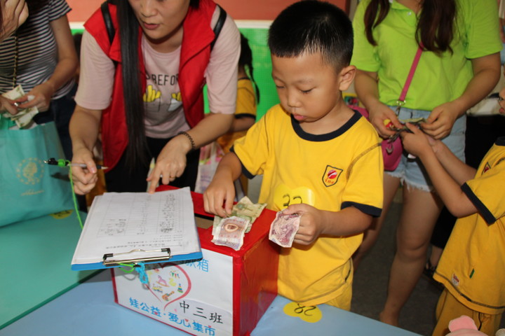 義賣活動結束后小朋友和家長共同把義賣得到的錢投入到募捐箱內,并由行政老師清點捐款。