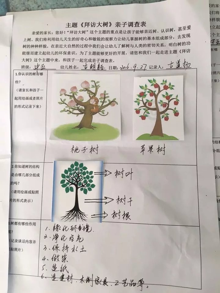 同時老師發動家長在平時帶著幼兒到附近走走,觀察自己生活周圍的樹的特征,并和幼兒一起制作樹葉筆記或者樹葉拼貼、拓印,既能幫助幼兒了解大樹,又能增進家長和孩子之間的交流與合作。真是兩全其美!