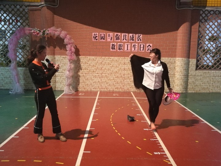 搞笑而歡樂的開場舞串燒,逗得在場的教職工們捧腹大笑,這是一份最奇特的生日禮物。接下來是好玩的游戲時間,這次工會為大家準備了兩個游戲,分別是傳遞吸管和我唱你跳,教職工們分組競賽,大家通力合作、團結(jié)一致。場上摩拳擦掌,場下吶喊聲、加油聲不斷。這是一份最特別的生日禮物。緊接著,曾園長、馬主任、大張老師、小張老師為壽星們獻上了最真摯的生日祝福,這是一份最溫馨的生日禮物。