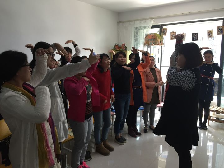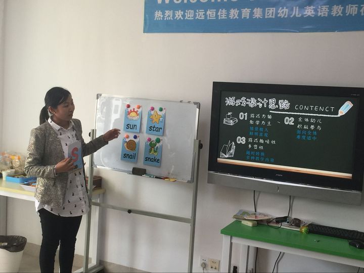 春意漸濃,朝氣蓬勃的三月。為了增強(qiáng)幼兒學(xué)習(xí)英語的興趣(Interesting),為了提升幼兒聽與說的質(zhì)量(Quality),為了培養(yǎng)幼兒的語音意識(shí)(Phonological awareness),形成英語思維(English thinking),為將來的語言學(xué)習(xí)奠定堅(jiān)實(shí)的基礎(chǔ),提高活動(dòng)組織中游戲的有效性。2017年3月2日,集團(tuán)下屬8所幼兒園,25名英文教師在幼教中心孫老師的帶領(lǐng)下前往海論英語工作室開展了為期一天的教師集訓(xùn)。此次活動(dòng)40%的講解+60%的體驗(yàn),教師參與教研的積極性(Enthusasim)、主動(dòng)性(Initiative)、實(shí)效性(Effectiveness)都得到了大大的加強(qiáng),學(xué)習(xí)氛圍濃厚,得到了老師們認(rèn)可和贊許。