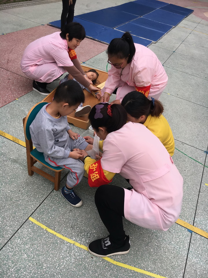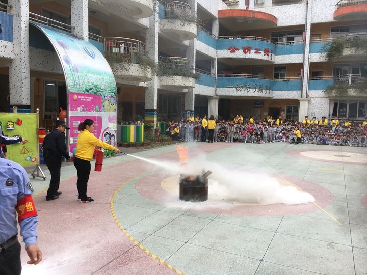 幼兒園對本次消防逃生演練進行了精心策劃和嚴密組織,成立了以下疏散演練指揮組(1)報警組(2)疏散組(3)救護組(4)滅火組(5)警戒保衛組,并。在消防演練前召開會議,明確了演練步驟、老師職責、疏散路線等具體要求。各班老師也在演練前對孩子進行了消防安全知識教育,學會如何預防火災,如何在火場進行自救逃生等知識。消防演習的緊急疏散過后,師生與救護組一同模擬被困救援。救護組與老師配合將受傷幼兒迅速帶離到操場,救護組用自己豐富的工作經驗,有條不紊的引導老師與她們一起給兩名受傷幼兒進行緊急處理。這次演練與以往不一樣的是后勤主任給孩子們講解消防安全知識后,大班的哥哥姐姐進行了火場逃生技能展示:1.火災發生時,煙氣大多聚集在上部空間,煙氣具有溫度高、毒性大特點,穿過濃煙逃生時要盡量身體貼著地面或是匍匐前進,用濕毛巾捂住口鼻;2.彎腰低姿前行,用濕毛巾捂住口鼻迅速撤離;3.受到火勢威脅時,披上浸濕的衣物、被褥向安全出口沖出去。接著由管理處的消防人員介紹了滅火器的使用步驟及運用技巧、現場演示滅火器操作流程并讓教職工現場操作滅火器使用。