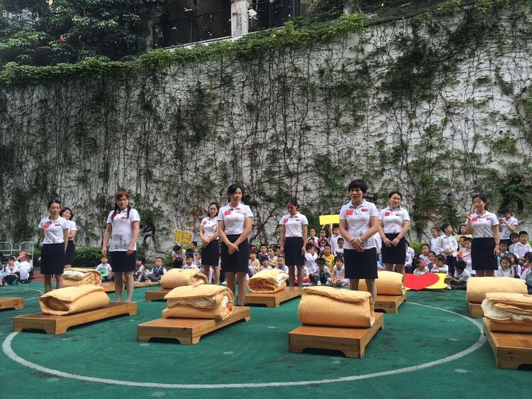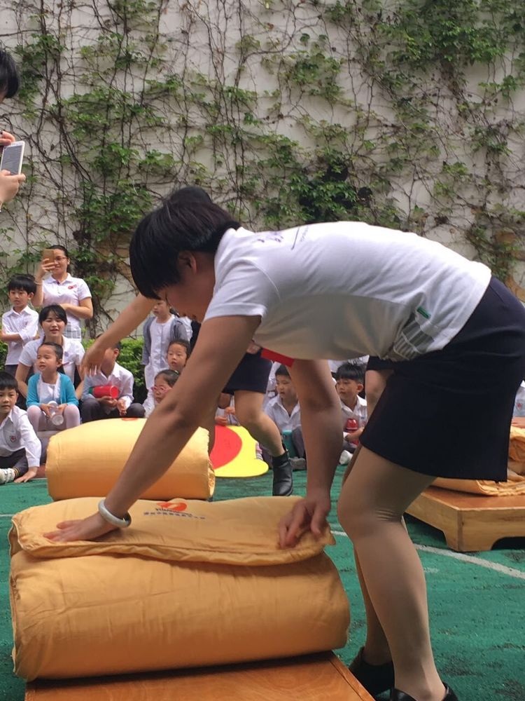 在主持人一聲號令下,保育老師們迅速地開始疊被子。從他們整齊有序的動作可以看出平時老師們也是如此熟練地為咱寶寶們收拾打理的。
