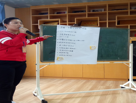 觀看了幼兒的早操后,我們進行分組研討,首先討論了一日生活有哪些類型、我們討論得出有“生活活動、體育活動、自主游戲活動、學習活動”。接下來我們組研討的是則是“各幼兒園半日活動安排”,研討后各組進行代表發言,領導點評。