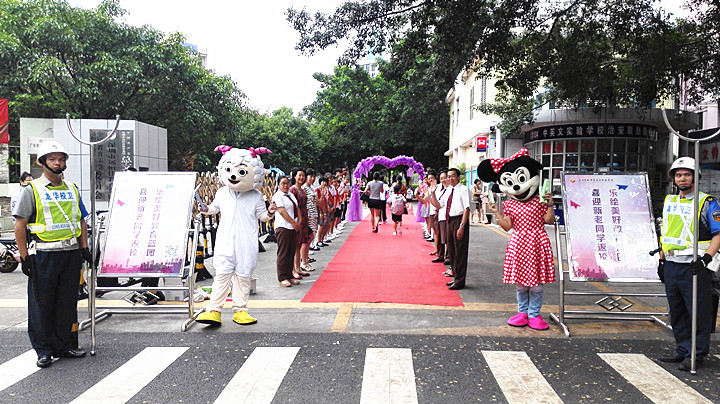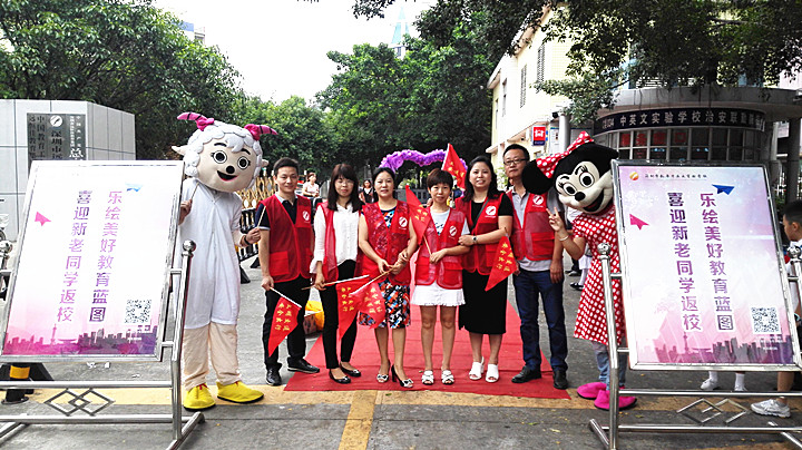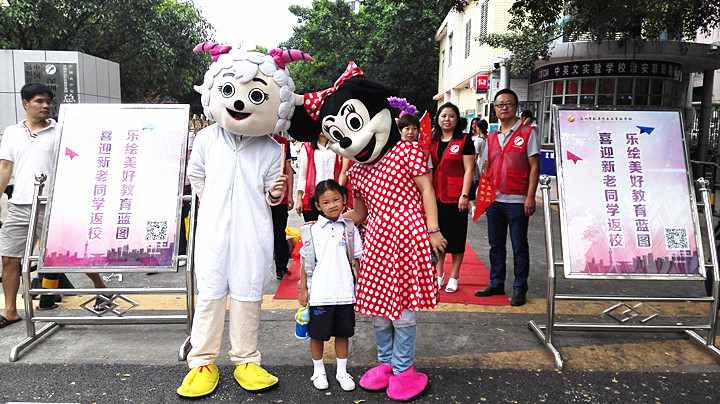 2017年9月1日晨,同學們早早背上書包,邁著輕盈的腳步去上學。來到龍華中英文實驗學校門口,咦!這么熱鬧,這么喜慶!原來是學校卜校長帶領干部、師生、家長代表一早就到學校大門口喜迎新老同學返校。還有美洋洋和Minnie為同學們贈送鉛筆、尺子、文具盒等小禮物呢!