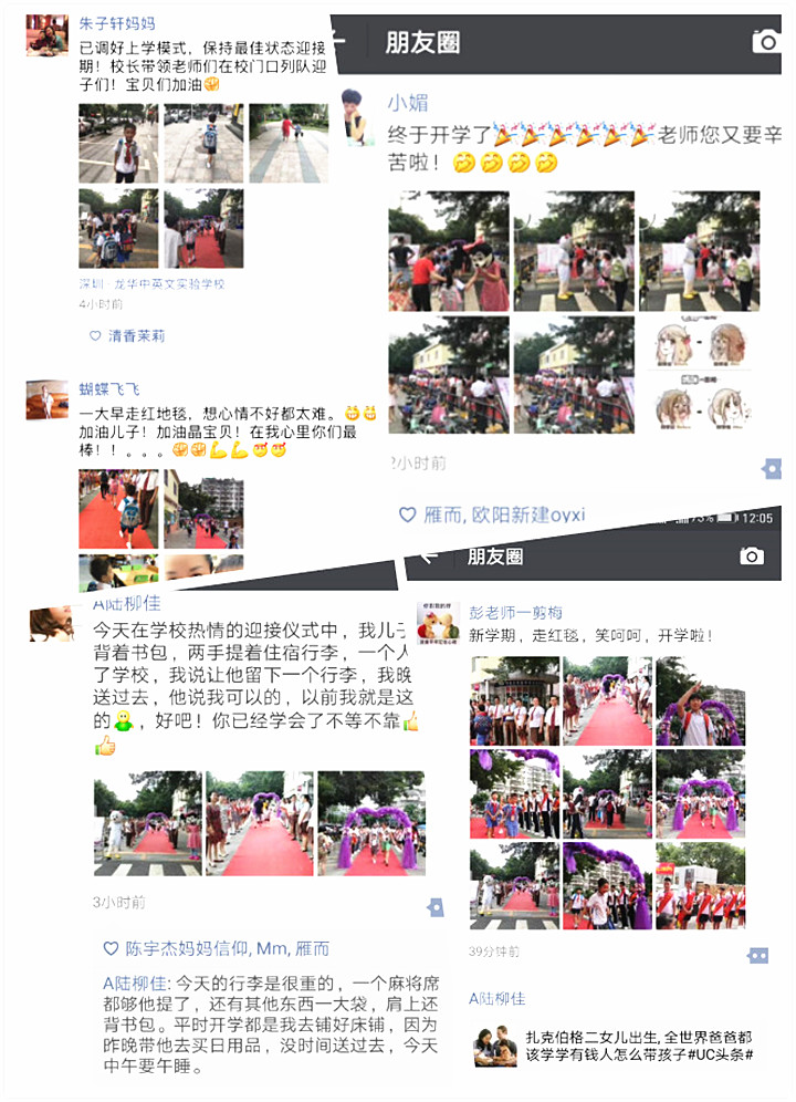 學校別具特色的入學歡迎禮,引來了第一天來校上班上學的師生、送孩子入學的家長、甚至是路人的關注,大家紛紛圍觀拍照,發微信朋友圈,QQ相冊曬照片、視頻,記錄下這難忘的情景,曬出這美麗的一刻。大家紛紛稱贊龍華中英文開學第一天愛滿校園,為學生營造了一個多彩的學習生活環境,給了孩子們開學第一天美美的好心情,為新的學期、新的學年開了個好頭!