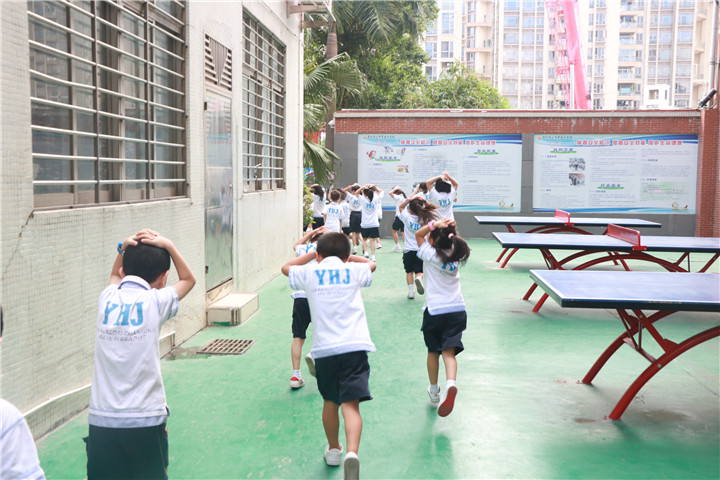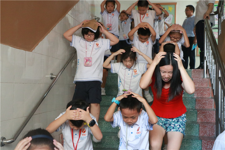 第二階段,接著,學生們聽到“緊急疏散”的信號,在老師的指揮下,從教室的不同出口有條不紊地向操場疏散,彎腰護頭,動作到位,安全有序地到了疏散地。