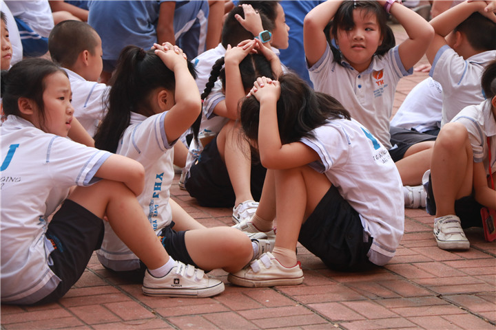 第一階段,演練過程中,當學生們聽到“地震發生”的信號,老師組織學生進行避震,反映迅速,動作標準。