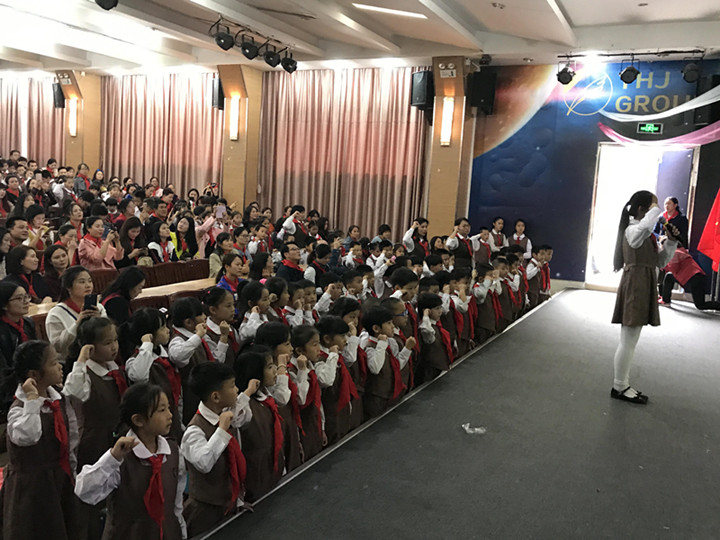這次入隊儀式除了遵循正常的入隊程序外,與以往入隊儀式最大的不同之處是279位孩子的家長也戴著紅領巾來到現場和孩子們一起參加入隊儀式,當《少年先鋒隊隊歌》的音樂響起全體家長和一年級的孩子們一起高唱隊歌,那一刻現場的每一個人無不感受到少年先鋒隊組織的神圣,新隊員充滿對少先隊的渴望,家長們重溫了兒時難忘時刻,一些爺爺奶奶眼里噙著淚水,仿佛自己又成為了一名光榮的“紅小兵”。