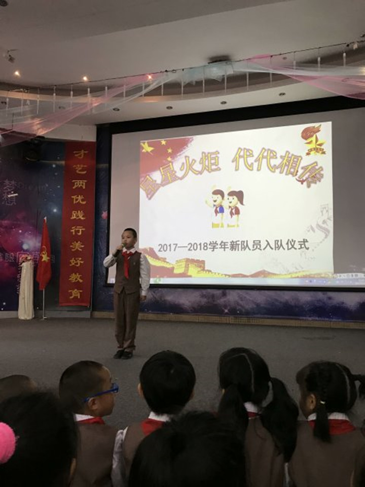 伴隨著嘹亮的隊歌,一年級279名新隊員被批準加入中國少年先鋒隊,成為一名光榮的少先隊員,在雄壯有力的出旗曲中,少先隊旗手與護旗手們邁著整齊的步伐,精神抖擻地進行著莊嚴的出旗儀式,少先隊入隊儀式由此拉開帷幕。