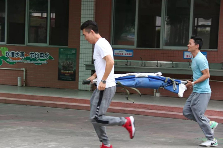 救援隊第一時間趕往事發地點進行搶救并把“受傷”學生送往安全地帶