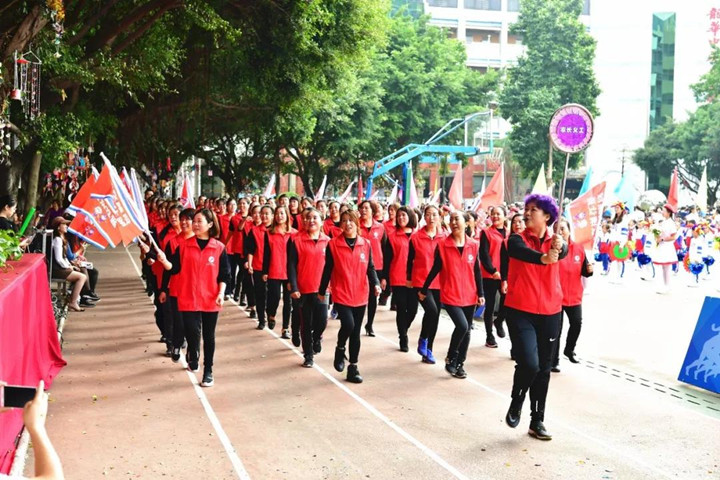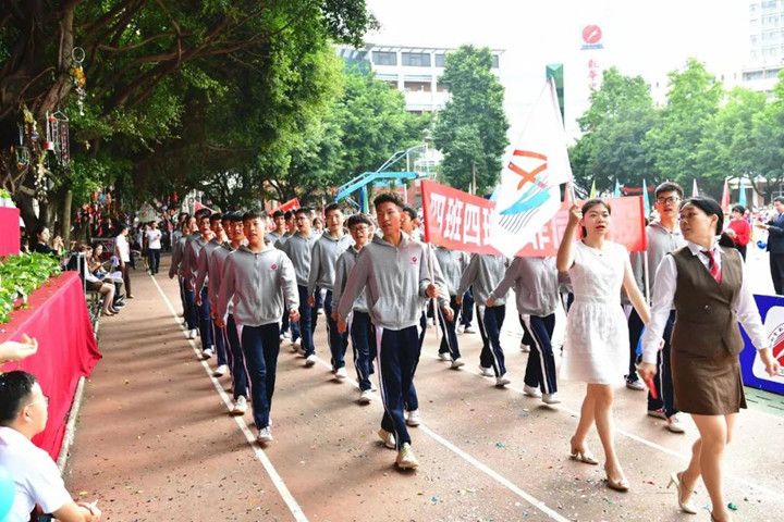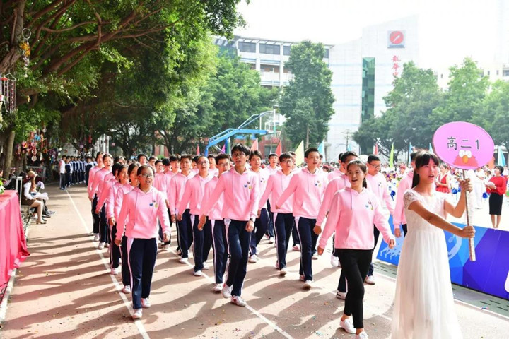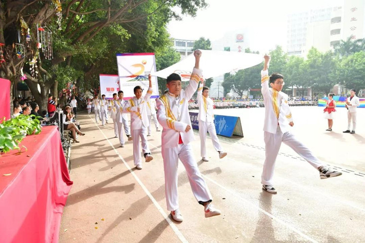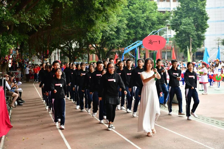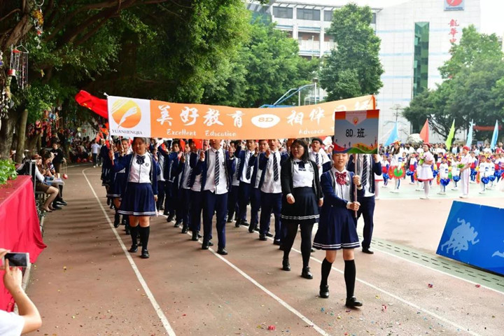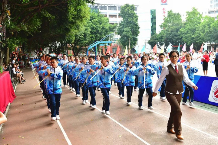 首先進行的是隊列式表演,小學、初中、高中等70多個方陣魚貫入場,一時運動場上形成了一道由色彩鮮艷的服裝和絢麗多彩的道具組成的靚麗風景,學生們步伐矯健,口號嘹亮,精神抖擻,走出了士氣,走出了自信,贏得了家長和來賓的陣陣掌聲。