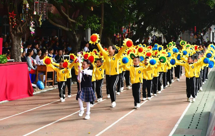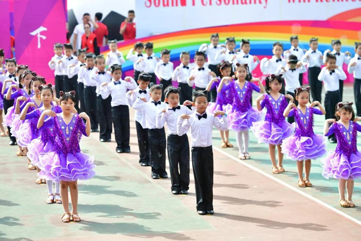 學生大型團體操和舞蹈表演在《彩旗飄飄》中展開,全校小學、初中、高中2000多人分別參加了繩操、打擊樂、跆拳道、拉丁舞、啦啦操、響扇、球類組合等大型節目演出,全面展示了本學期體育、藝術“分組分項”教學改革及“2+2”項目實施的成果。宏大的活動場面、精彩的表演深深吸引住了家長和來賓,孩子們開心的笑容、激昂的神情感染了全場,引來喝彩聲陣陣,歡樂不斷回響。