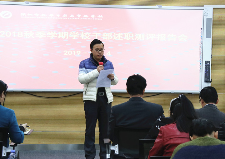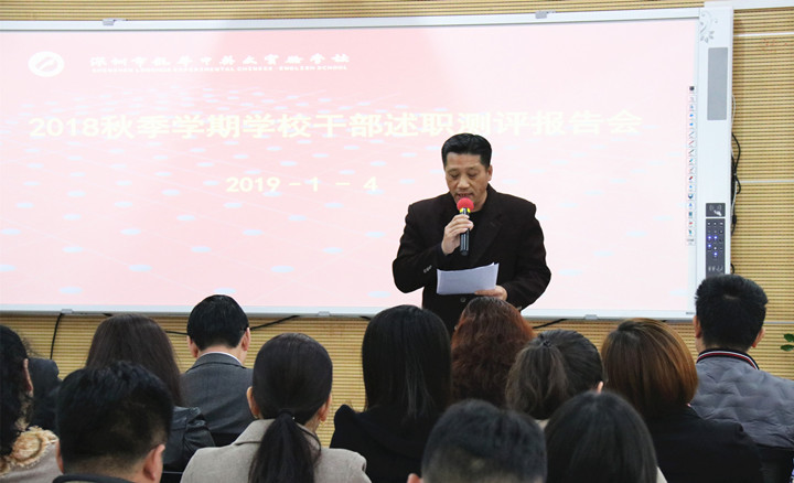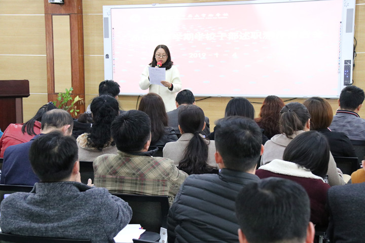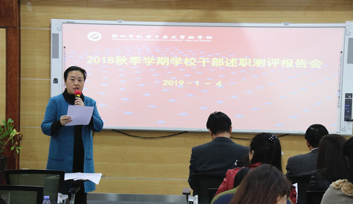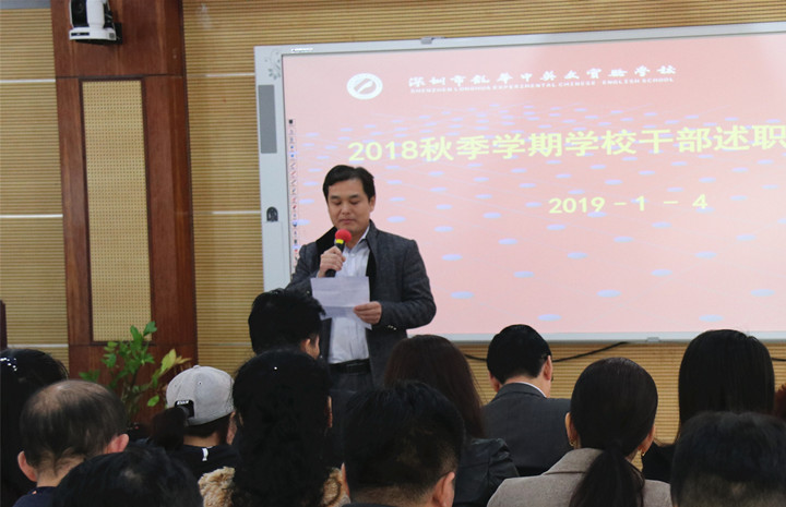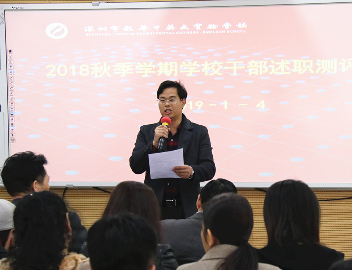 時間: 2019-01-11 作者:龍華中英文實驗學校 閱讀次數: 31192019年01月04日下午,我校“2018秋季學期干部述職測評報告會”在教師培訓中心召開,學校14名干部在會上進行了學期工作總結,來自小學、初中、高中、藝體信息四個部門的50名年級主任、學科主任、班主任及家長代表聽取了報告會,并進行了現場民主測評。總結報告會及測評工作由學校金玉善副校長主持,全國名校長、特級教師、學校卜祥林校長,學校胡化忠副校長,以及集團戴桓標副總裁參加了報告會。