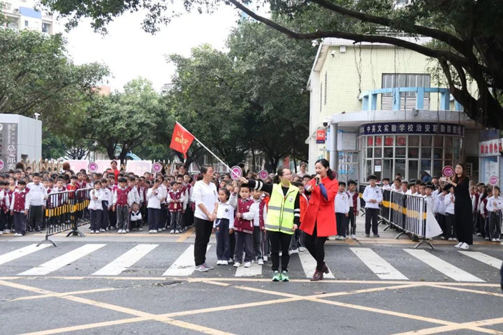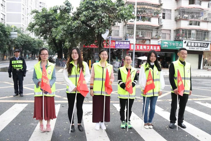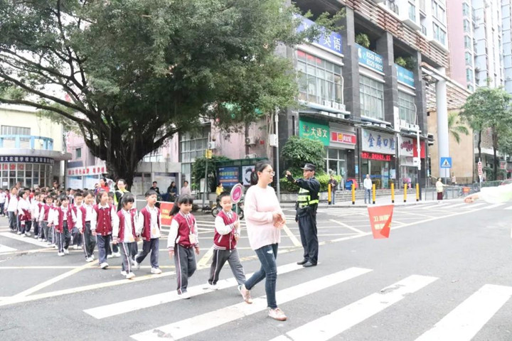 接著,一年級六名副班主任身穿家長義工服,手持指揮旗,分別在校門口六個崗位做好護航指揮。活動通過學生親身體驗,極大地增強了交通安全意識,提高了同學們過馬路的自護能力。