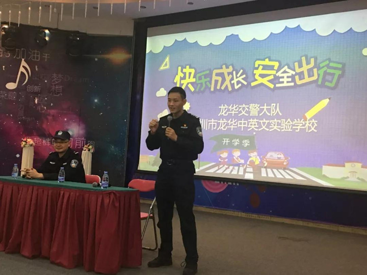 龍華交警大隊唐警官給同學們介紹交通安全知識