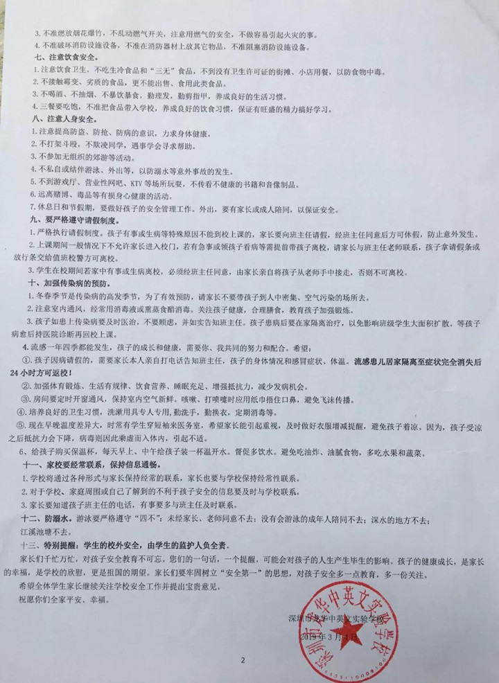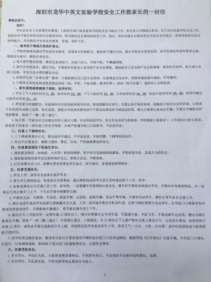 本學期開學三周來,學校開展了多項安全教育活動,一是通過開學前的安全隱患大排查大整治確保師生開學安全。二是通過《安全教育第一課》主題班隊會課進行安全知識講座。三是組織全校師生收看深圳市教育局和深圳市公安局組織的《交通安全第一課》。四是通過發放《安全教育工作致家長一封信》提醒家長關注安全工作。
