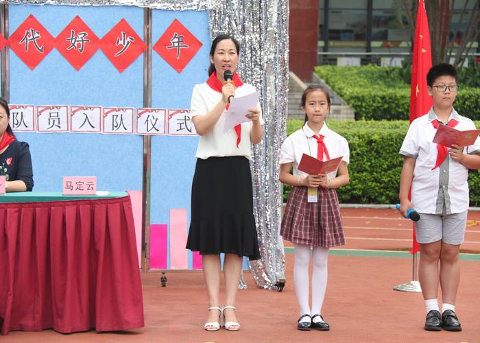 少先隊大隊輔導員馬定云老師在儀式中發表了講話。她在向新隊員表示祝賀的同時,激勵新老隊員用實際行動“踐行核心價值觀,爭做時代好隊員”。整齊響亮的“時刻準備著”的呼號表達了隊員們為紅領巾增添光彩的決心、信心和恒心。