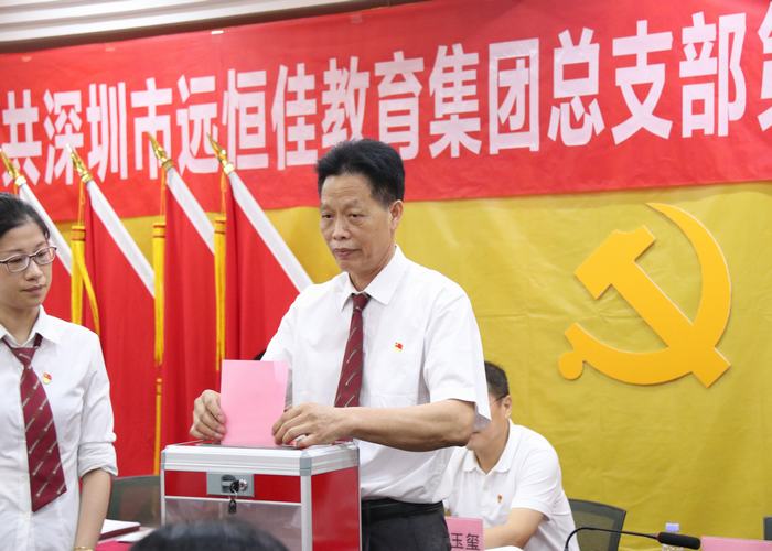 接著由現(xiàn)任集團黨總支部書記宋遠標(biāo)同志代表黨總部支委員會作了題為《強化黨的政治核心引領(lǐng),聚心聚力共謀優(yōu)質(zhì)發(fā)展》的報告。報告從“黨總支部的基本情況、六年來的主要工作回顧、取得的成績與不足、黨總支部對未來工作的建議”四大方面進行了全面總結(jié)。聽取完工作報告后,與會黨員認(rèn)真審議并表決通過了宋遠標(biāo)總支書記所作的報告。隨后按照會議議程分別舉手表決通過了《中共深圳市遠恒佳教育集團總支部選舉辦法》及監(jiān)票人、計票人建議名單。在充分醞釀新一屆遠恒佳教育集團黨總支部委員會候選人預(yù)備人選的基礎(chǔ)上,以無記名投票、差額選舉的辦法選舉產(chǎn)生了由宋遠標(biāo)、戴桓標(biāo)、王開利、鄧木金、蔡文娜等5名同志為新一屆深圳市遠恒佳教育集團黨總支部委員會委員。最后,新一屆深圳市遠恒佳教育集團黨總支部委員會召開第一次會議,選舉產(chǎn)生了集團黨總支部書記宋遠標(biāo)同志和集團黨總支部副書記戴桓標(biāo)同志,同時對集團黨總支部委員的工作進行了分工,并將選舉結(jié)果上報到龍華區(qū)委教育工委審批。