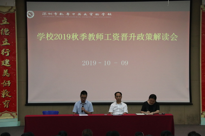 時間: 2020-01-02 作者:龍華中英文實驗學校 閱讀次數: 38372019年10月9日,學校召開了本學期第二次全體干部、教師大會,進行了師德、“創文”、安全等方面的培訓,同時對2019-2020學年教師工資晉級方案進行了解讀,會議由金玉善副校長主持。