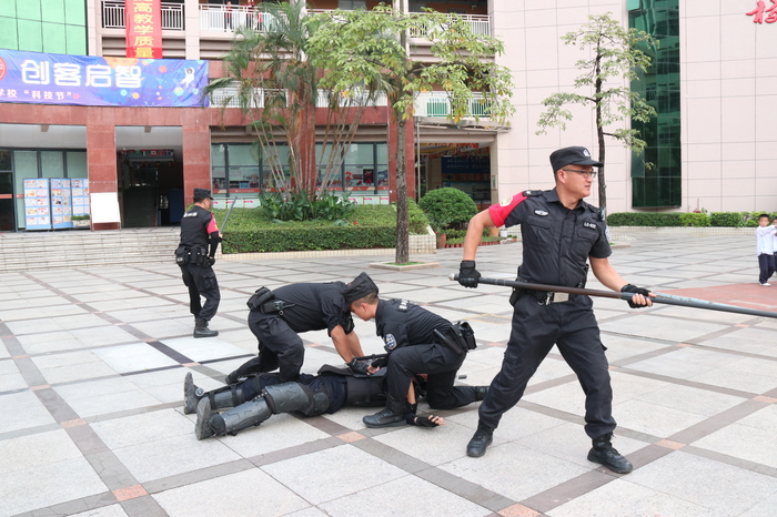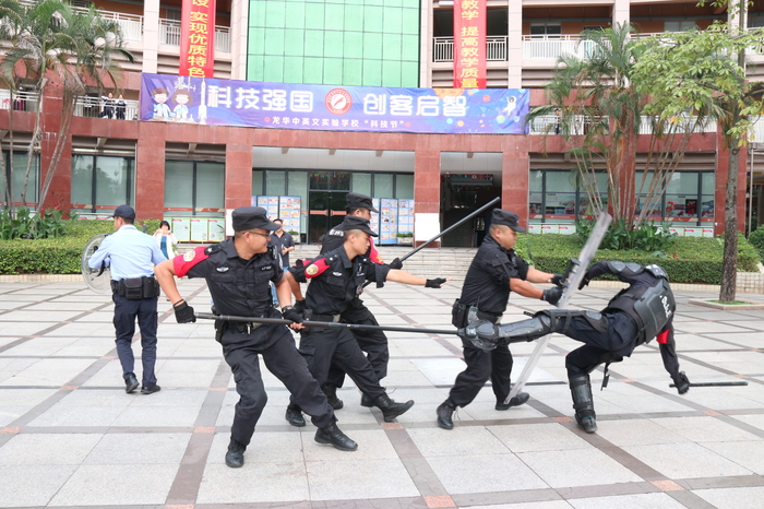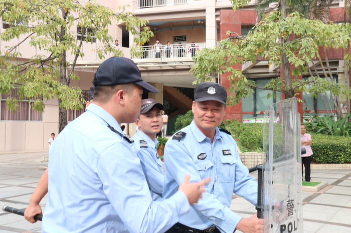 實戰訓練中,龍華區龍城派出所防恐沖鋒隊隊員先后就齊眉棍、鋼叉、盾牌等專用反恐防暴器材的使用方法、注意事項及攻防技能進行了全面的培訓,并與學校安保人員進行了六場次的實戰演練。