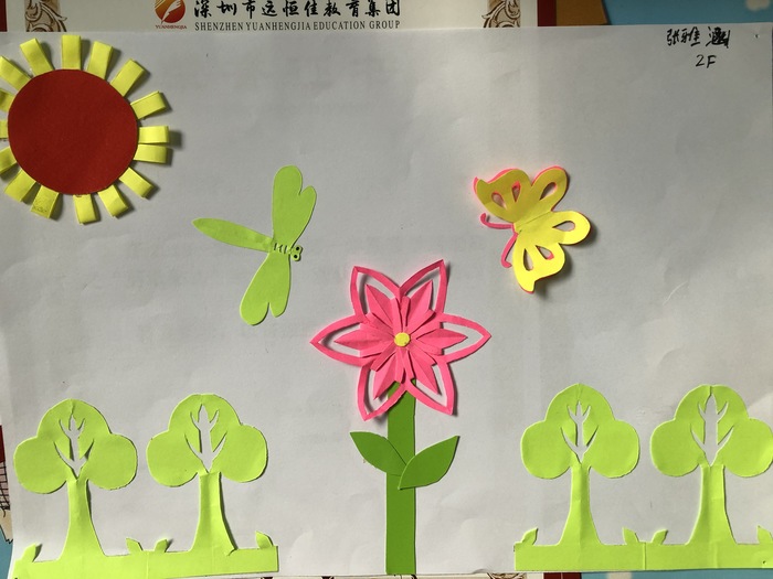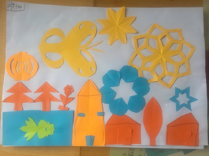 運用數學課上學習的“對稱圖形原理”剪出各種圖案,并創意粘貼成畫,既鼓勵孩子們充分發揮想象力和創造力,又滲透傳承中國傳統剪紙文化,一舉多得。