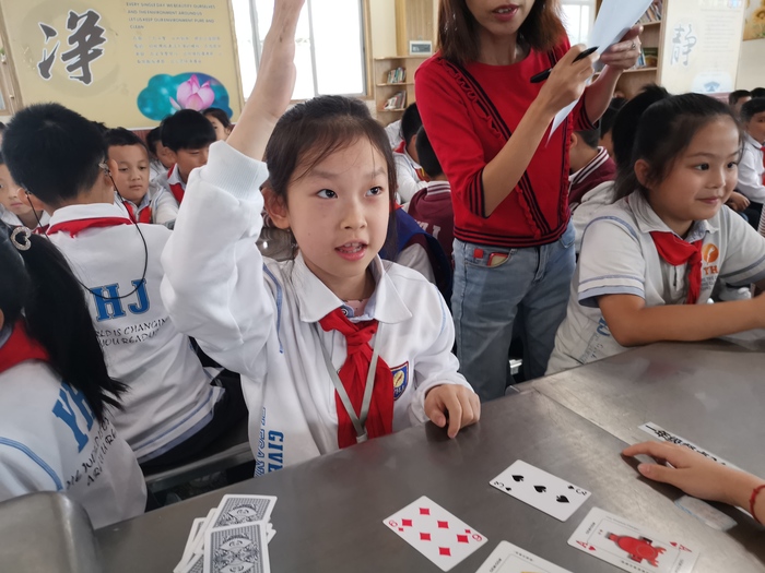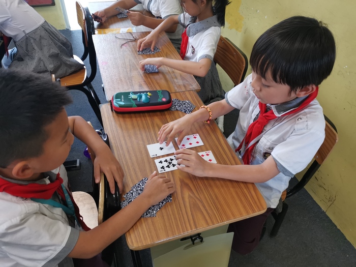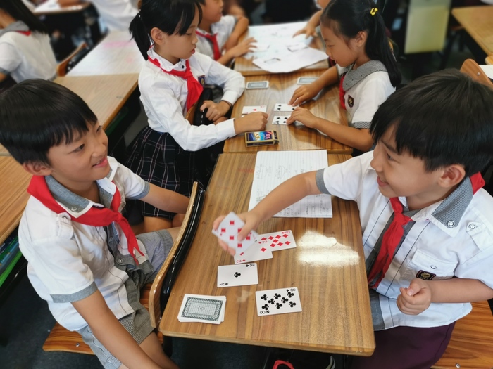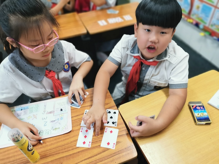 剛剛開啟兩個月學習生活的小一學生,使用“數學排序”思維做游戲,以最快的速度翻出1-9的數字紙牌。孩子們眼神專注,興趣盎然。