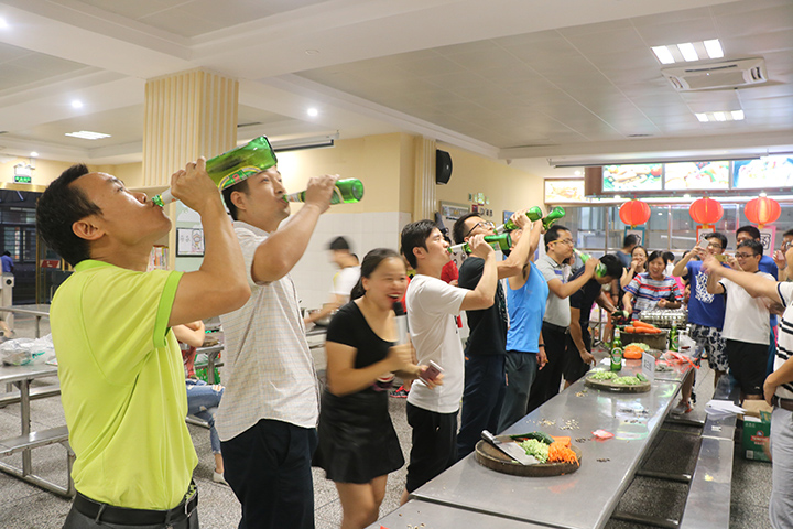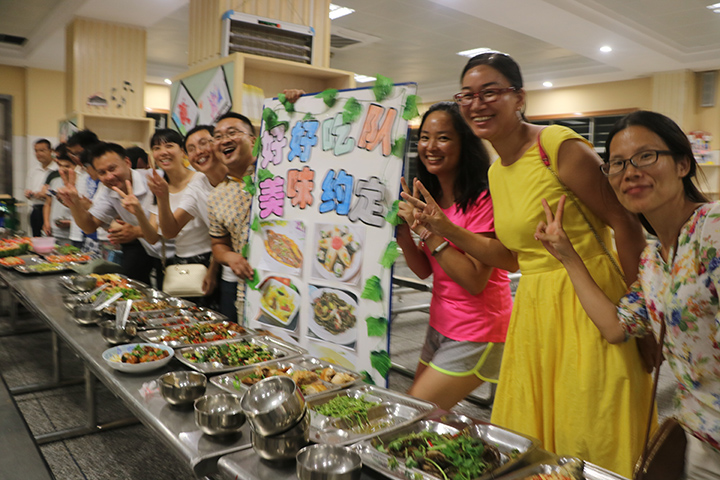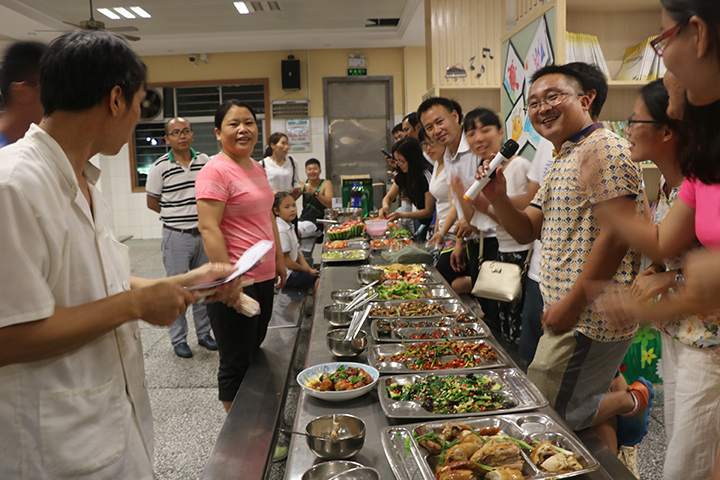 教師廚藝比賽是公明中英文學校建設幸福校園,活躍教職工業余生活的一項舉措。活動將全校教師分成六個組,每組給予一定的經費,食材自行購買,要求每組各出16個菜,其中4個菜參加評分,其余的菜參與交流。活動當天正好是運動會,老師們得以有時間到市場精選食材。下午5點鐘,運動會結束,學生全部離校后,老師們按照事先的分工有序的忙碌起來。洗菜、切菜、雕花、拼盤,平時溫文爾雅的老師現在儼然一個個大廚,鍋鏟飛舞、菜色琳瑯、滿室顠香,各組選派的廚師們輪番上陣,一人一個自己的拿手好菜,“我心飛翔”、“青龍臥雪”,不但看得人垂涎欲滴,連名字都起得這么有意境。在另一個賽場,進行的是”刀工、嗑西瓜子、喝啤酒和蒙眼喂甜筒比賽,比賽規定,四個項目積分最后的一個組,全組組員要喝苦瓜汁。為了不讓自己的組員出丑,場上隊員盡力表現,場下組員吶喊助威,滿臉的奶酪、對瓶吹啤酒的表情,嗨翻了全場。