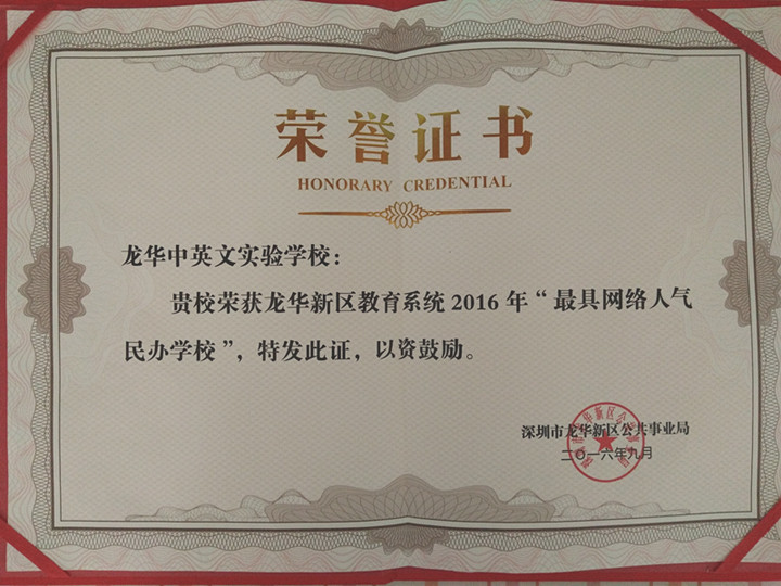 2016年09月,深圳市龍華中英文實(shí)驗(yàn)學(xué)校獲評(píng)“龍華新區(qū)教育系統(tǒng)2016年最具網(wǎng)絡(luò)人氣民辦學(xué)校”,此次上榜的學(xué)校全區(qū)僅有三所。