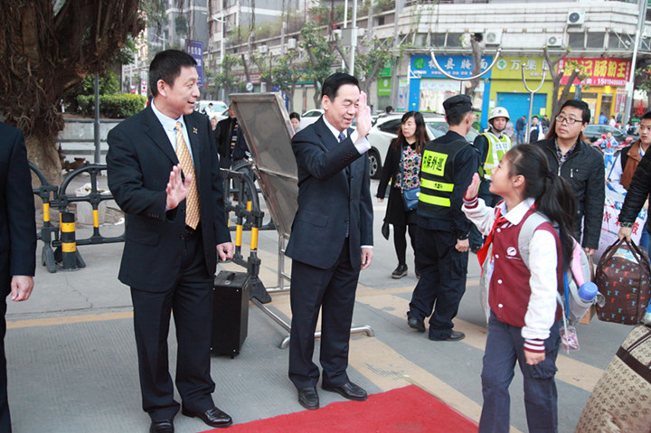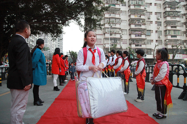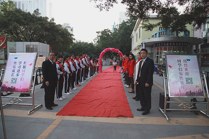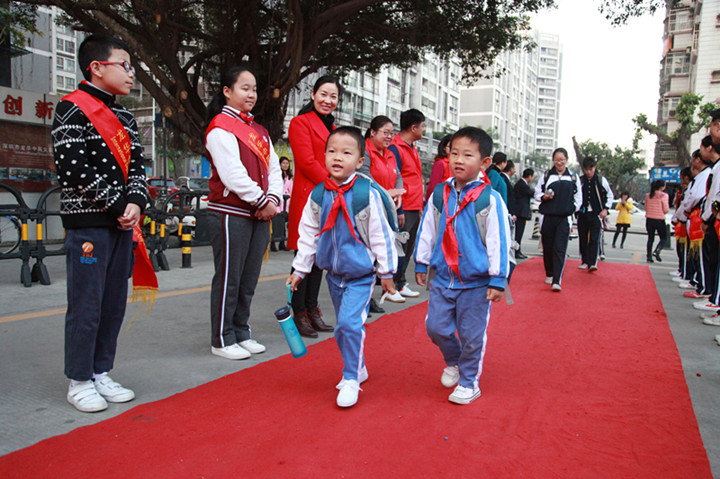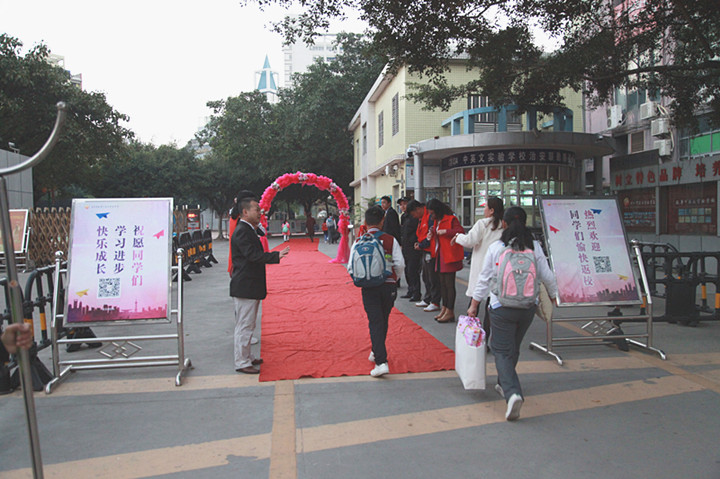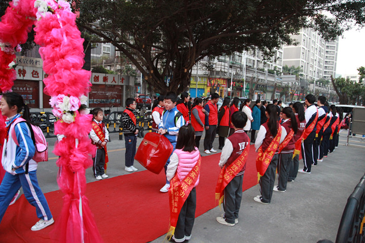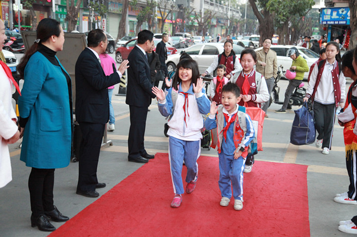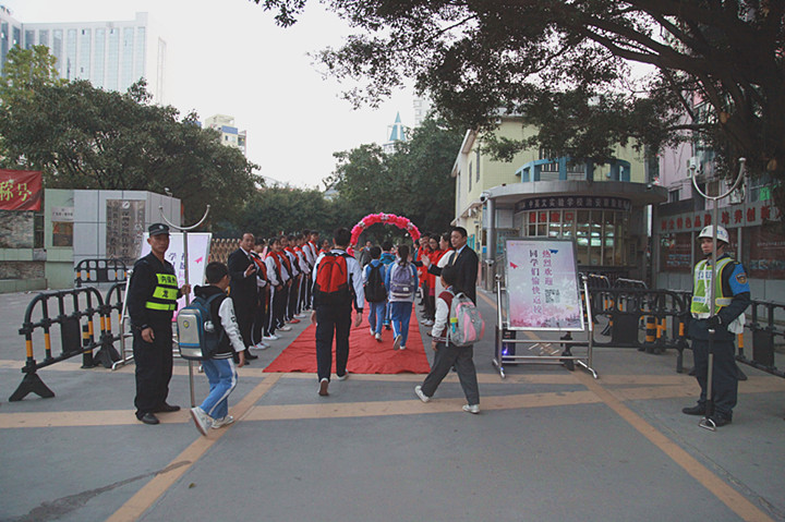 2017年02月13日早6:30,當第一位同學迎著朝陽,帶著快樂上學的同學來到校門口時,被眼前的一幕驚住了:由花門、紅毯、師生夾道、問候、敬禮、歡聲、笑語、歌曲等組成的歡迎禮道,讓孩子小臉紅紅的,“老師好!同學們好”的問候語情不自禁地道了出來。我們看到了來校同學發自內心的快樂。