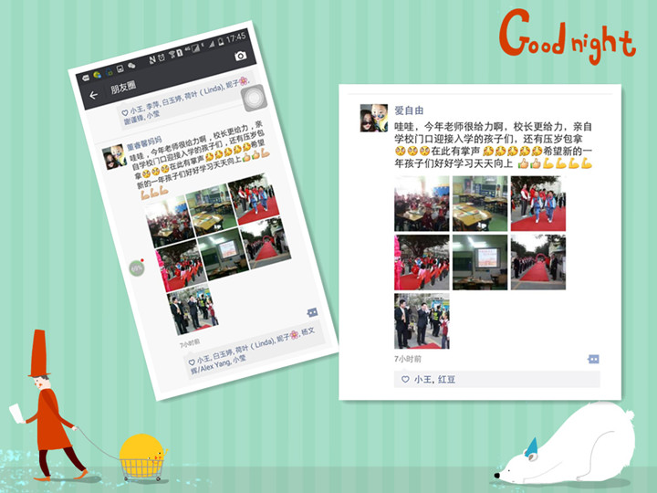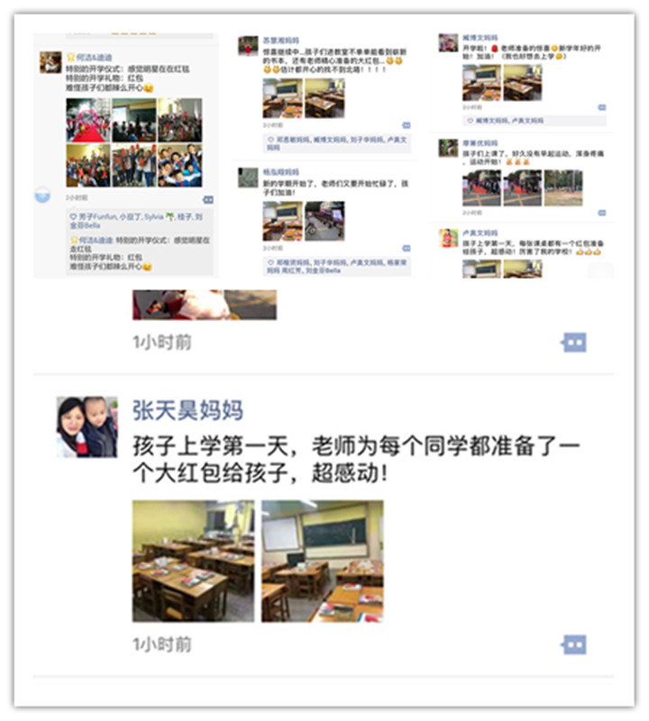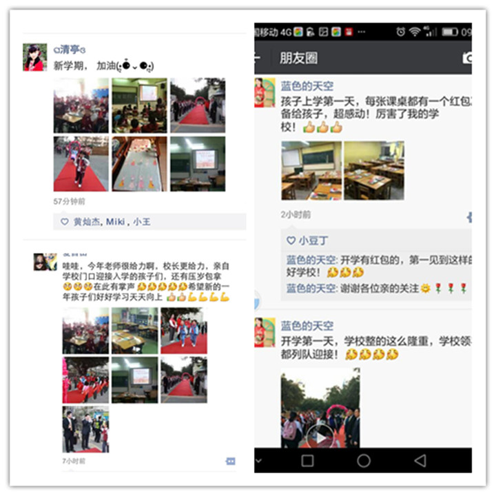 家長“藍色的天空”在朋友圈中發圖片說:“孩子上學第一天,學校整得這么隆重,超感動!厲害了我的學校!”;家長“沙”發朋友圈說“開學啦!老師給同學們帶來了驚喜,新學年好的開始,加油!”
