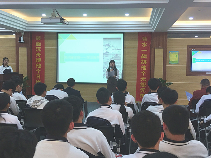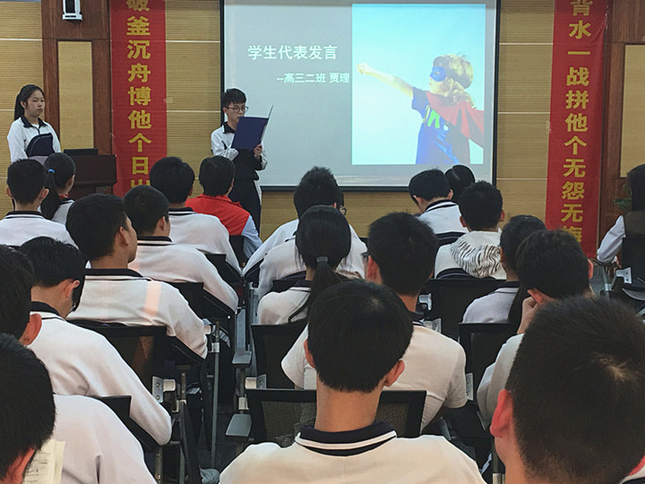 下午5時(shí)許,學(xué)生會(huì)主持人梁佳婷同學(xué)宣布會(huì)議開(kāi)始。大會(huì)在嘹亮的國(guó)歌聲中拉開(kāi)序幕,全體師生起立,奏唱國(guó)歌。首先,高三(2)班的賈理同學(xué)代表全體高三學(xué)生發(fā)言。他說(shuō):“少年自有少年狂,藐昆侖,笑呂梁,磨劍十年,今將試鋒芒!如果說(shuō)之前的十二年是漫長(zhǎng)的馬拉松,那么現(xiàn)在,我們已進(jìn)入那最后的沖刺階段。讓我們不負(fù)父母的期盼,不負(fù)恩師的囑托,不負(fù)學(xué)校的厚望,頑強(qiáng)拼搏,全力以赴,鑄就輝煌!”