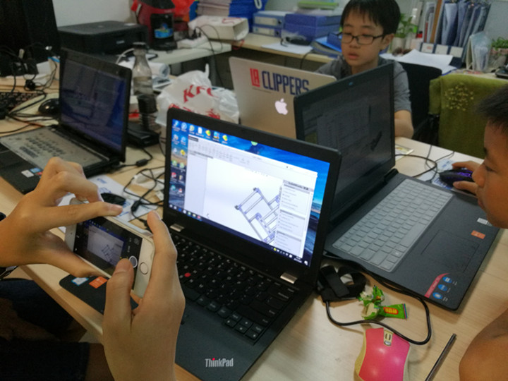 《校園清掃車》這一創客項目作品,是基于《開源FEG無人車》的結構進行車架模型搭建,學生們通過調研學校清潔工清掃校園樹葉、垃圾等,在網絡搜集相關清潔車的資料,利用SolidWorks 三維設計軟件進行拼裝,然后再動手裝配,探索和不斷的改進最終完成的。