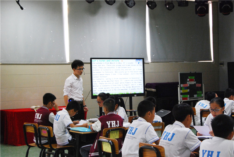 袁老師的課為一節聽說課,選自七年級上冊Unit 4 The four seasons,課型為Listening and speaking。課上,袁老師用流利的英語與學生交流,可以說師生間全程零困難溝通。袁老師反復讓學生跟讀模仿錄音,及時糾正學生的語音語調。