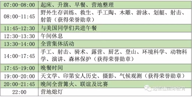 拓展新的社交圈、說一口流利口語(yǔ)、培養(yǎng)創(chuàng)造性思維、開闊眼界、提升領(lǐng)導(dǎo)才能、強(qiáng)健體魄、富有擔(dān)當(dāng)精神、掌握野外生存技能……放松自在的全英文環(huán)境,充滿善意的外國(guó)玩伴,豐富多彩的教學(xué)課程,賞心悅目的藍(lán)天碧水,除了讓你搖身變成“美國(guó)通”,還能獲得珍貴的跨國(guó)“戰(zhàn)友情”!