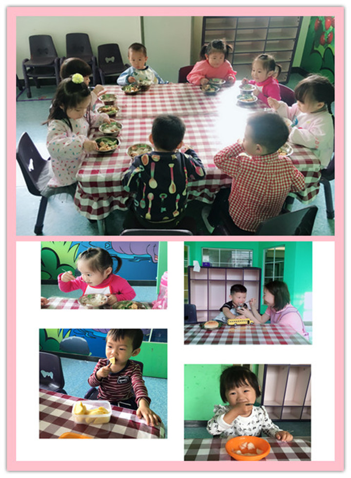 寶貝們剛來的時候有些寶貝都是要老師喂著吃飯,現在都是自己吃飯,一手扶碗一手拿勺,一口一口的慢慢吃,有時侯還跟小朋友老師比賽誰吃的多,誰吃的快。