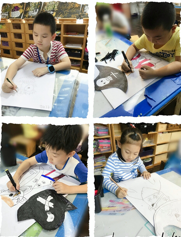 在我們的課程中,是通過創設寬松的談話環境,引導孩子去觀察、想象、思考,在實際操作中摸索繪畫方法,培養興趣,將給予孩子適當的指導,最后共同評價作品。