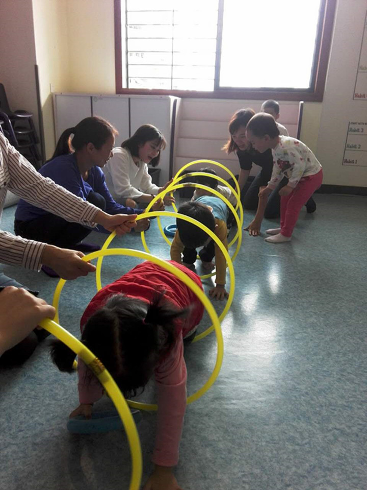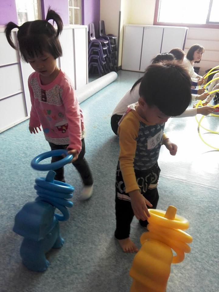 通過游戲手膝爬和雙腳跳的方式給小象的鼻子套圈,