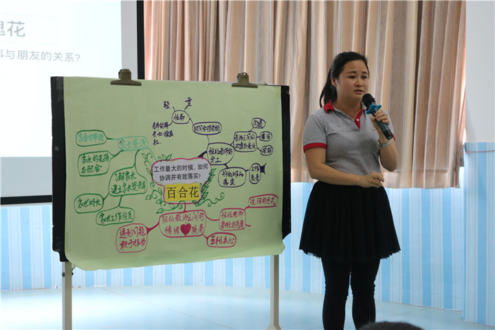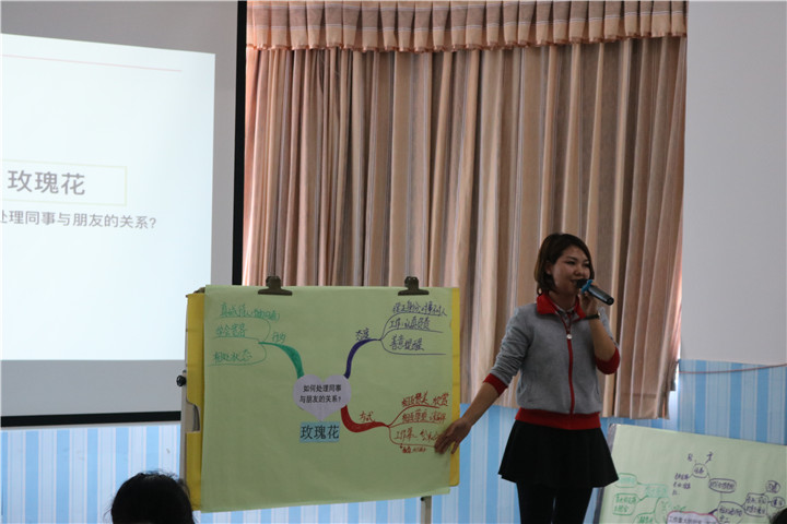老師們被分成三組研討分析如何處理工作量大、搭檔不穩定、如何平衡同事和朋友之間關系三個問題。老師們積極參與,各抒己見,遷移已有的經驗來解決問題。
