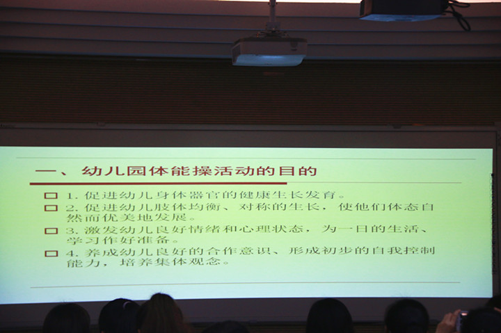 韓進(jìn)老師在幼兒園采集最原汁原味的幼兒早操活動(dòng)給學(xué)員觀看。幼兒園體能操編排的基本要求有四個(gè)部分:熱身(隊(duì)列)活動(dòng)——基本操節(jié)——體能鍛煉——整理活動(dòng)。在編排體操上選用器材與不使用器材的區(qū)別,選用器材是否符合主題,貼近孩子生活。