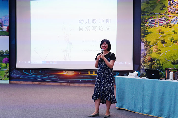 “行是知之始,知是行之成”,下午場我司邀請到了深圳信息職業技術學院講師,深圳市教育學會學前教育專業委員會第七屆理事熊和妮博士開展“幼兒園論文撰寫”專題培訓。當幼師遇上博士,又會擦出什么樣的火花呢?熊博士風趣幽默的講座風格,讓我們看到了不一樣的專家風采,原來面對寫論文,無論是博士還是幼師經歷的“心酸歷程”是一樣的。熊博士從論文標題、摘要、關鍵詞、正文格式與技巧,以及參考文獻的作用等方面作了詳細生動的講解,提出題目避免寬泛,觀點要明確、語言要嚴謹,還提到寫論文要注意程序,論文不是拼湊而成,而是要圍繞問題,解決問題。通過“選題策略”“研究方法”“寫作規范”“撰寫技巧”四個方面為老師們帶來了詳細的介紹,并列舉實例分享了很多實用的小妙招,如“雞蛋是怎么豎起來的”“磚頭有什么用”等鼓勵老師們去觀察、記錄和反思,并將這些轉換成文字,這些文字都可以成為很好的論文素材。