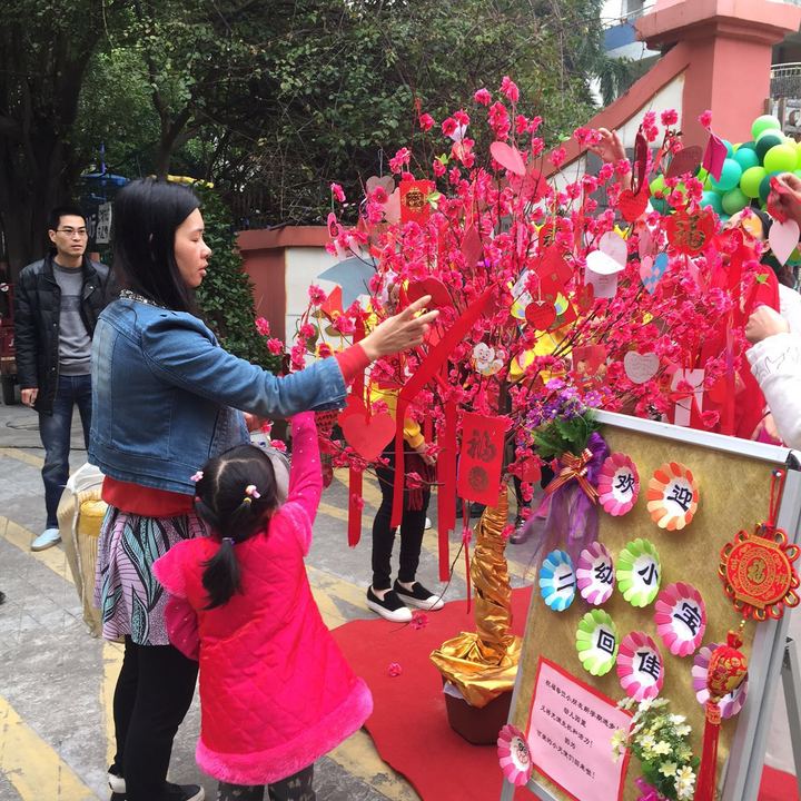 家長帶著孩子把新一年的心愿掛在桃花樹上!